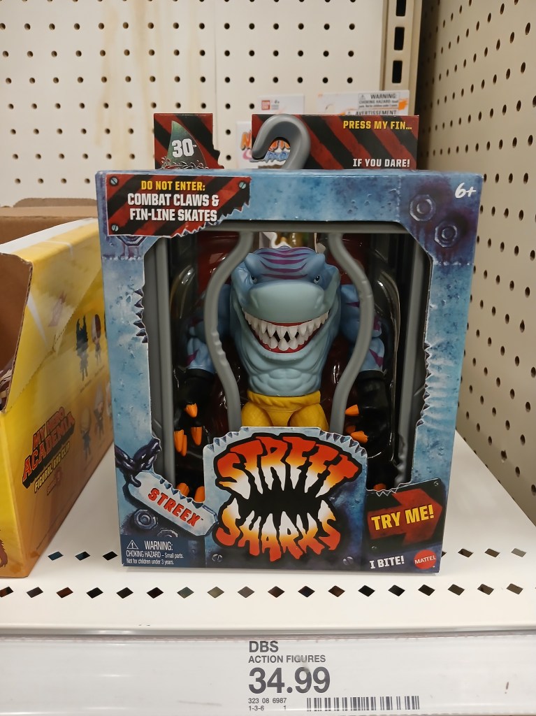 So this pic was taken back on Apr 30th this year. That evening I was perusing the local Target shopping center and decided to check out the current doodads and gadgets the kids are playing with these days when I spyed an action figure of Streex from the Street Sharks cartoon.